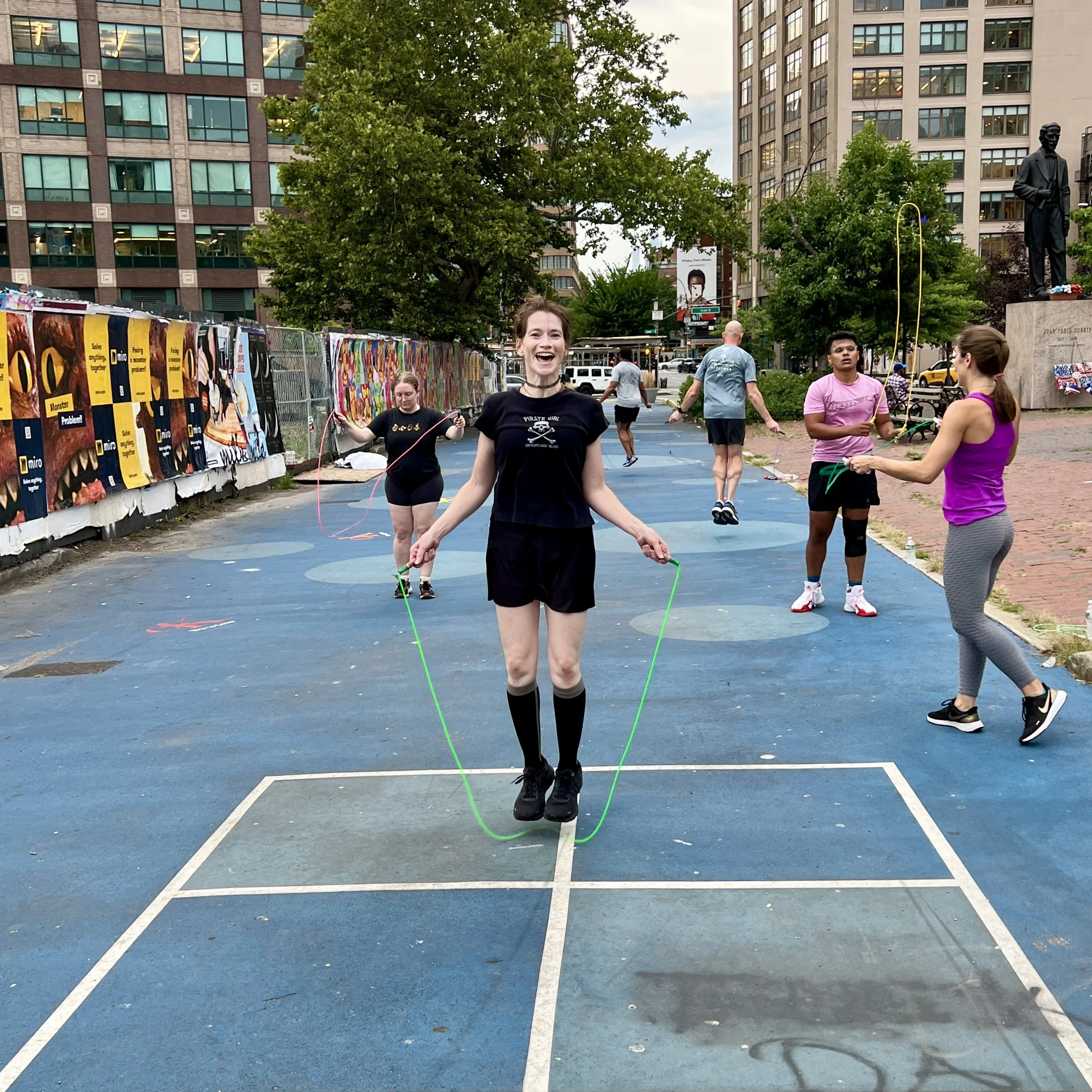 Punk Rope blends jump rope, calisthenics, and fitness games. It’s designed for all fitness and skill levels. Students range in age from 8 to 89.